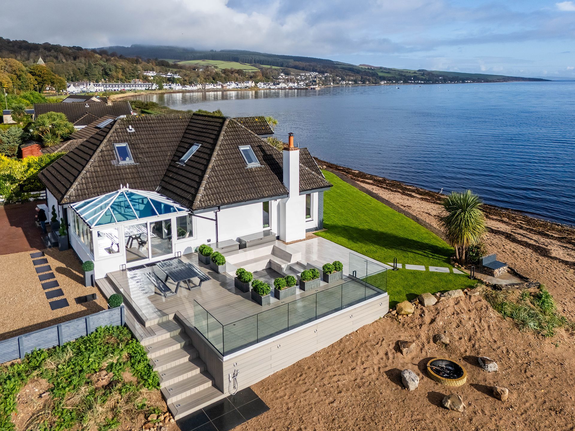 A rare corner-plot beachfront retreat with private steps down to the sand and open views across Lamlash Bay and Holy Isle.