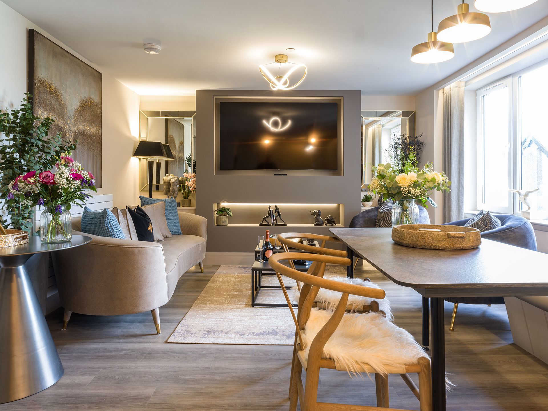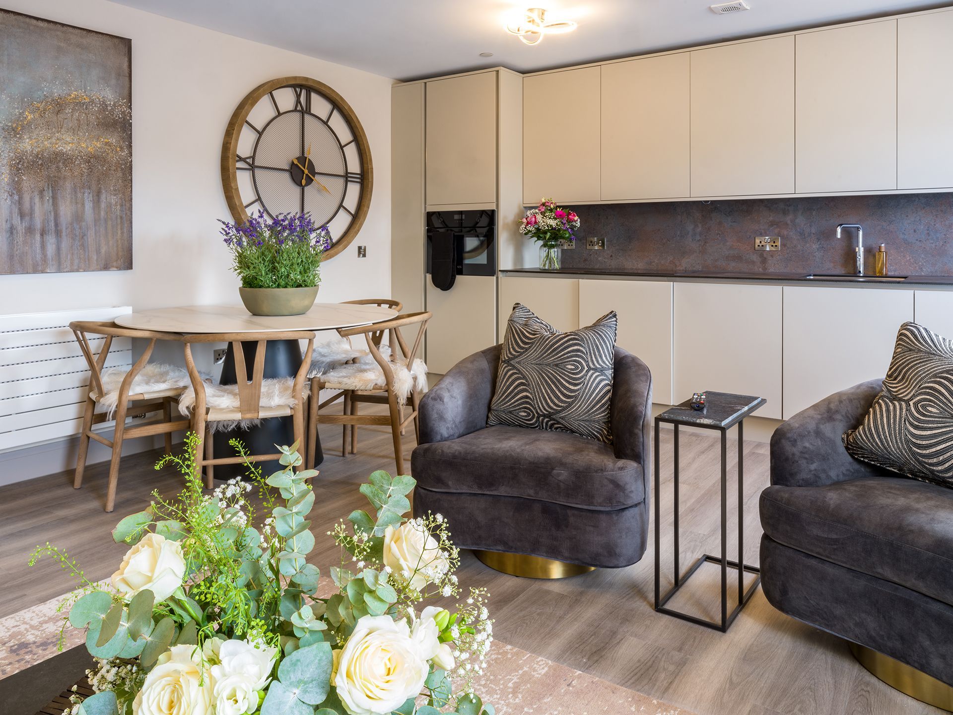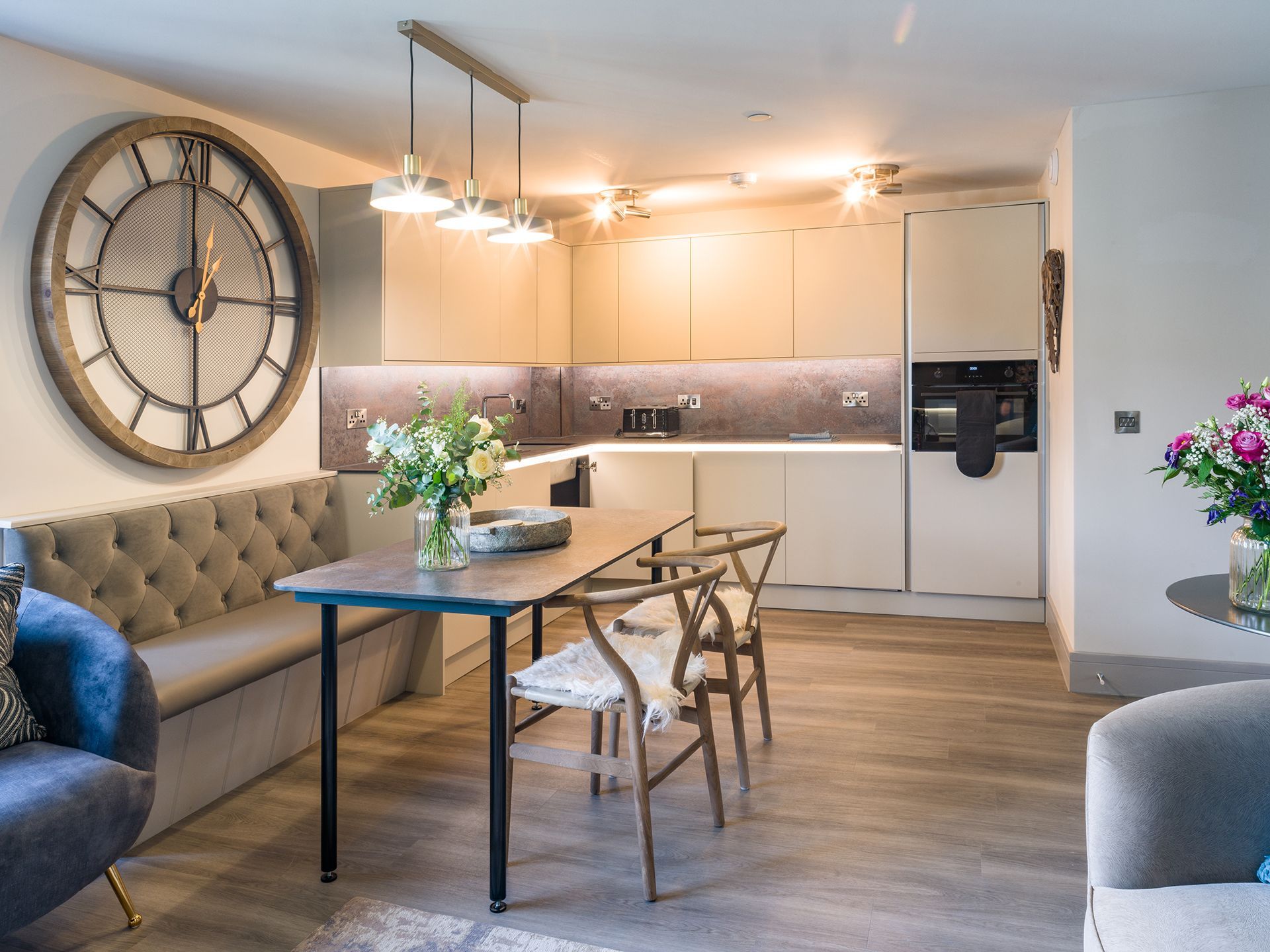 - Kitchen - fully equipped open plan L-shaped contemporary handleless kitchen with induction hob; combi-microwave/oven; Quooker tap; fridge/freezer; dishwasher and washer/dryer.