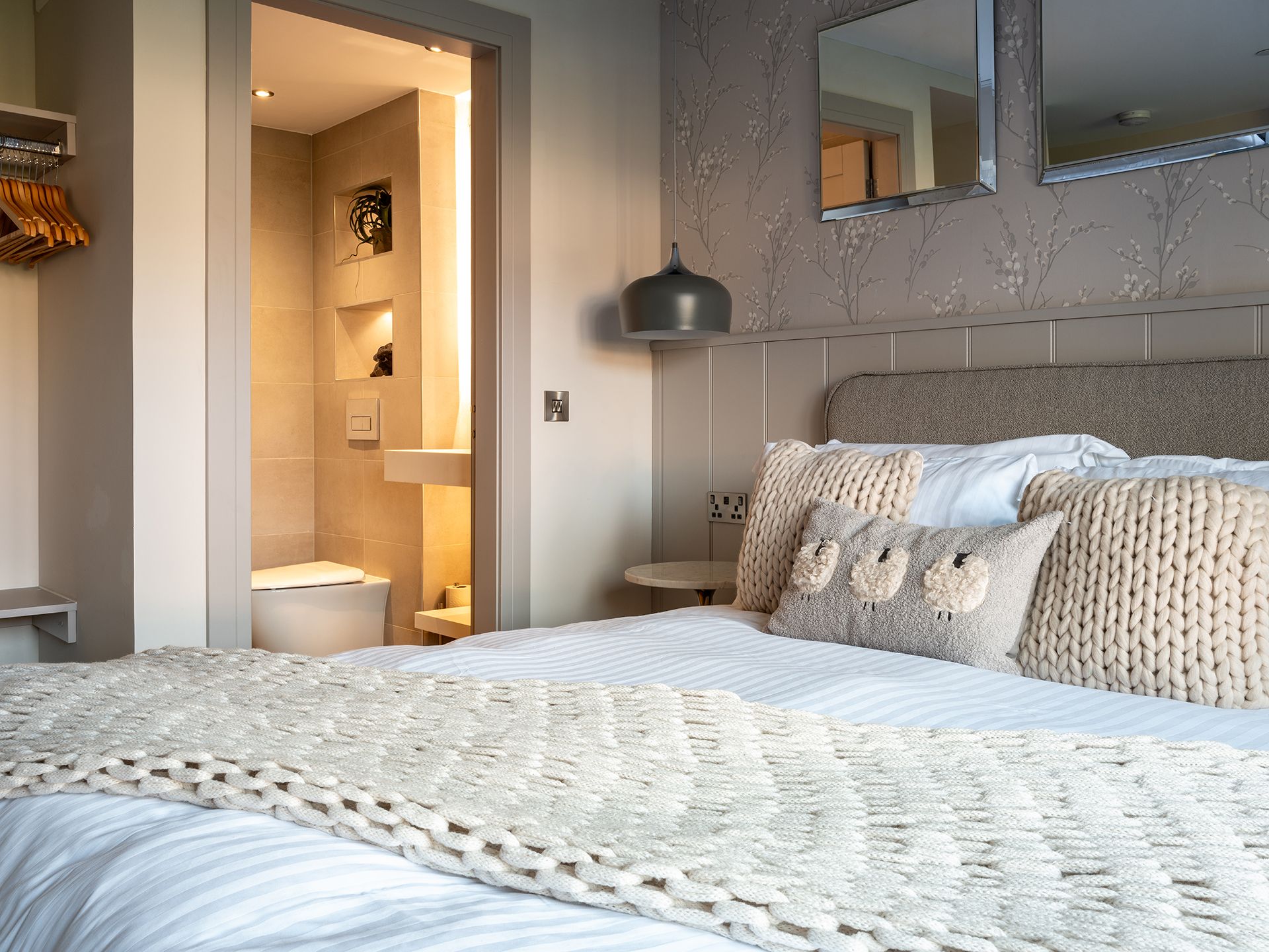 - Bedroom 2 (en suite) - king size bed, panelled headboard with USB sockets, bedside pendant lights, Smart TV and en suite bathroom.